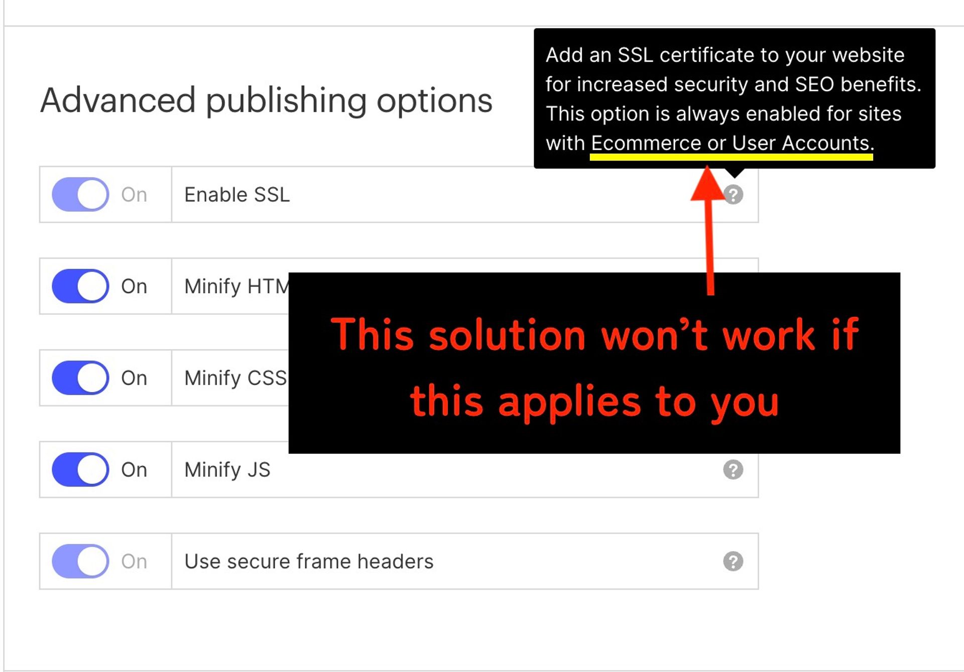 - Disable SSL in Webflow (go to Settings > Publishing > Scroll to Advanced Publishing Options)